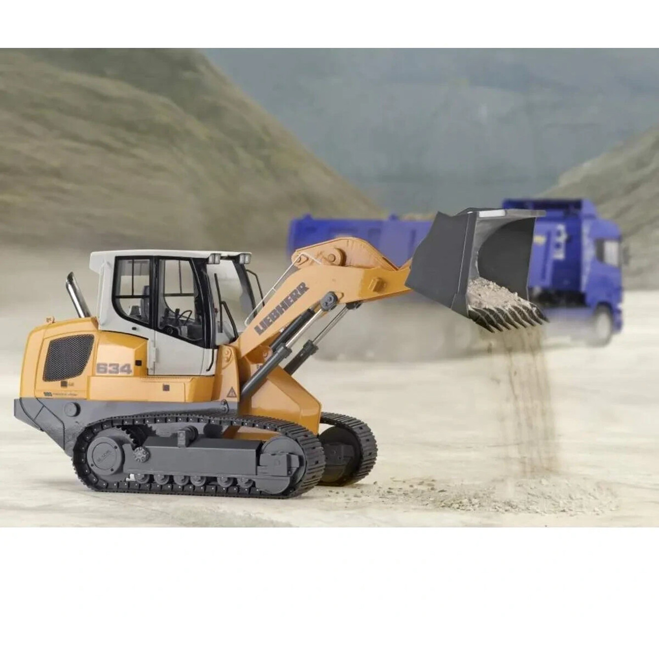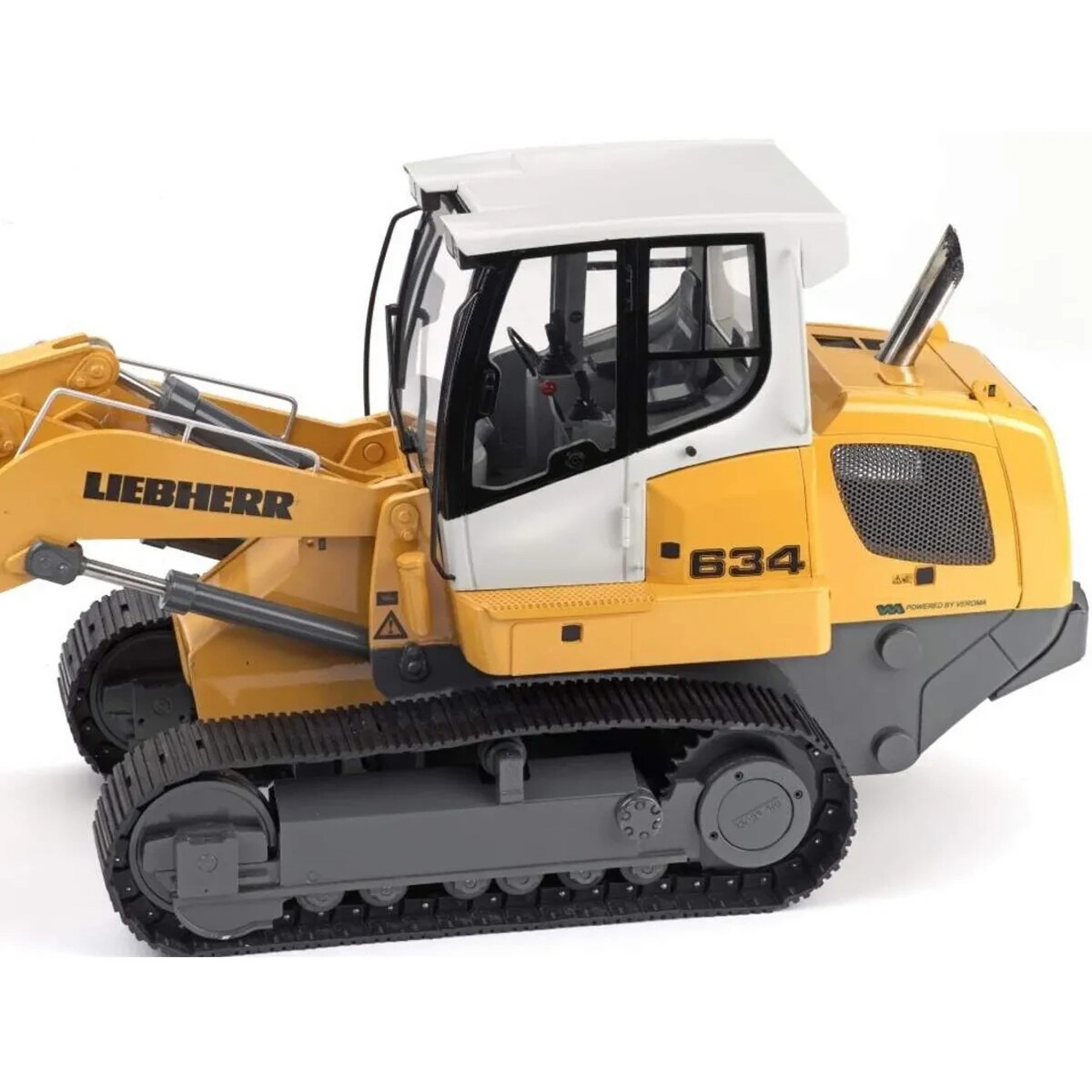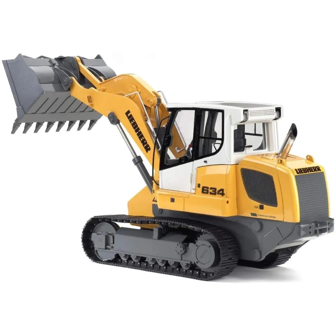Mit einer Länge von 530 mm, einer Breite von 170 mm und einer Höhe von 250 mm bietet die Liebherr-Laderaupe LR 634 ein imposantes Erscheinungsbild. Der Radstand von 189 mm sorgt zudem für Stabilität und optimale Manövrierfähigkeit. Trotz der Größe überzeugt das Modell mit einem moderaten Gewicht von 8.000 g, was den Transport und das Handling erleichtert.