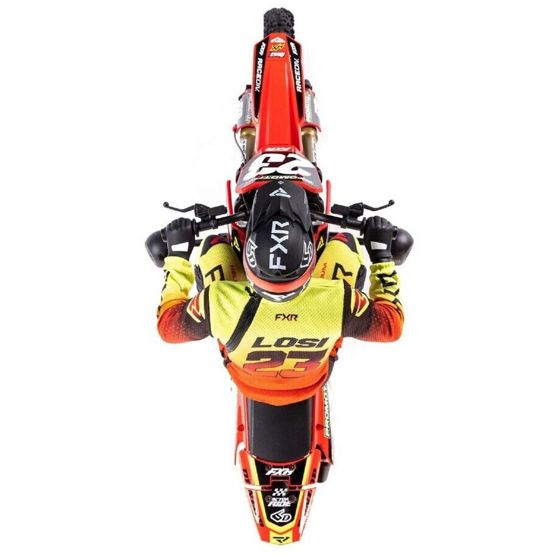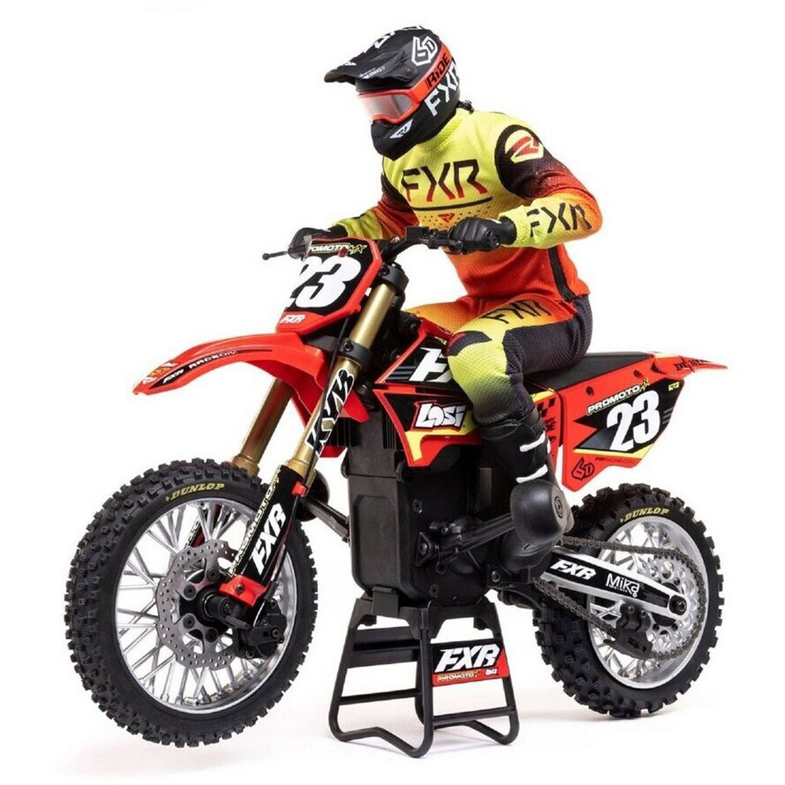 Erleben Sie die Performance und den Nervenkitzel des Losi RC-Motorrad Promoto MX RTR Combo 1:4 rot (LOS06000T1), ein wahres Meisterwerk der RC-Technologie. Dieses bereit-zu-fahrende Motorrad (RTR) kommt mit einer detaillierten und dynamischen Fernsteuerung, die Ihnen volle Kontrolle über jede Kurve und jeden Sprung bietet.